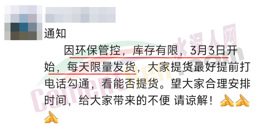 日前,山西某水泥企業發通知稱,因環保管控,庫存有限,3月3日開始,每天限量發貨,請大家提時提前預約。
