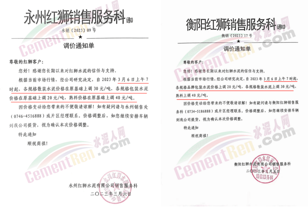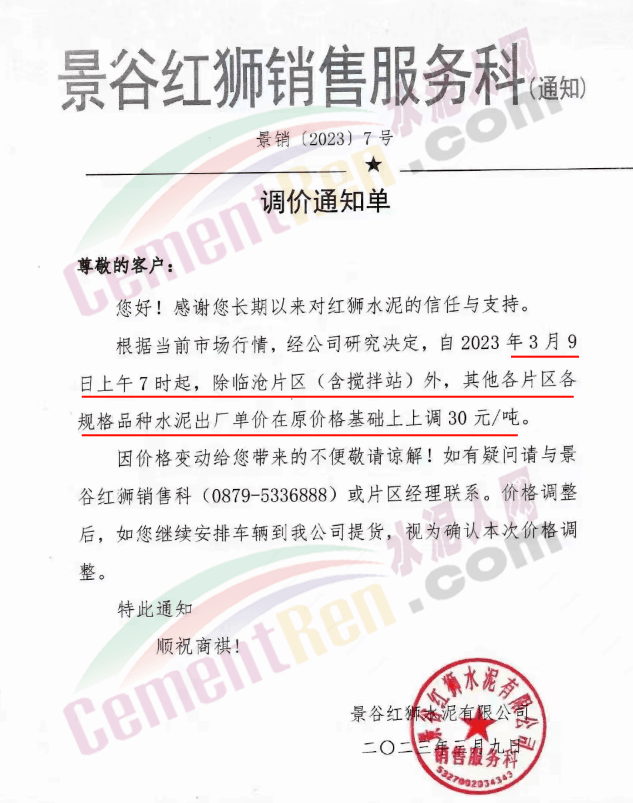 日前,云南區(qū)域景谷紅獅銷售服務(wù)科通知,根據(jù)當(dāng)前市場(chǎng)行情,經(jīng)公司研究決定自2023年3月9日上午7時(shí)起,除臨滄片區(qū)(含攪拌站)外,其他各片區(qū)各規(guī)格品種水泥出廠價(jià)上調(diào)30元/噸。