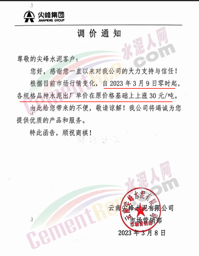 云南尖峰水泥通知,根據(jù)目前市場(chǎng)行情變化,自2023年3月9日零時(shí)起各規(guī)格品種水泥出廠價(jià)上調(diào) 30元/噸。