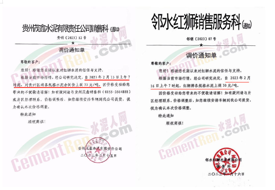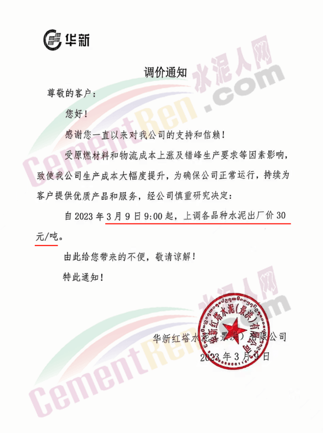 華新紅塔水泥(景洪)有限公司通知,受原燃材料和物流成本上漲及錯(cuò)峰生產(chǎn)要求等因素影響,致使公司生產(chǎn)成本大幅度提升,為確保公司正常運(yùn)行,持續(xù)為客戶提供優(yōu)質(zhì)產(chǎn)品和服務(wù),經(jīng)公司慎重研究決定,自2023年3月9日9時(shí)起,上調(diào)各品種水泥出廠價(jià)30元/噸。