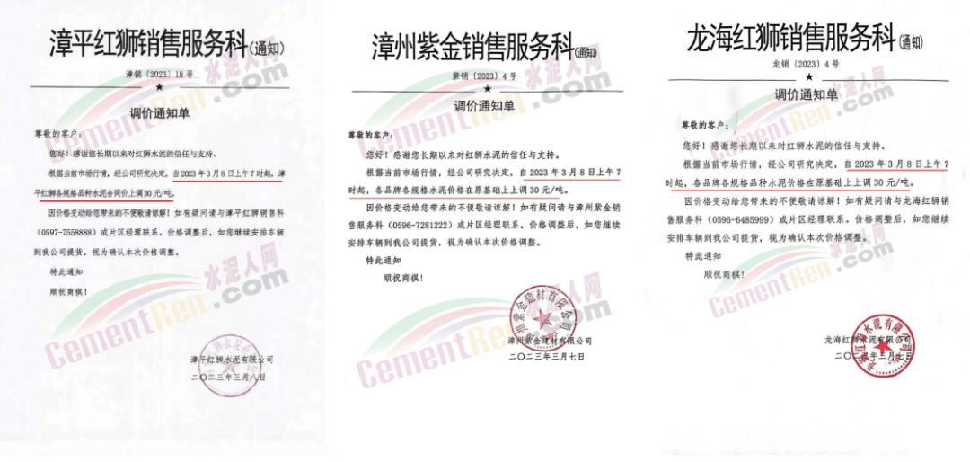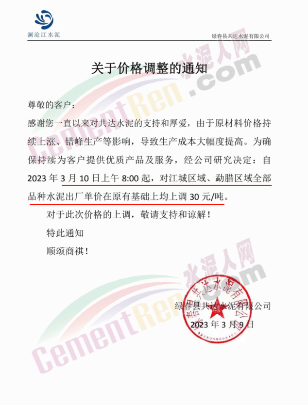 綠春共達(dá)水泥有限公司通知,由于原材料價(jià)格持續(xù)上漲、錯(cuò)峰生產(chǎn)等影響,導(dǎo)致生產(chǎn)成本大幅度提高。為確保持續(xù)為客戶提供優(yōu)質(zhì)產(chǎn)品及服務(wù),經(jīng)公司研究決定,自2023年3月10日上午8時(shí)起,對(duì)江城區(qū)域、勐臘區(qū)域全部品種水泥出廠價(jià)上調(diào) 30元/噸。