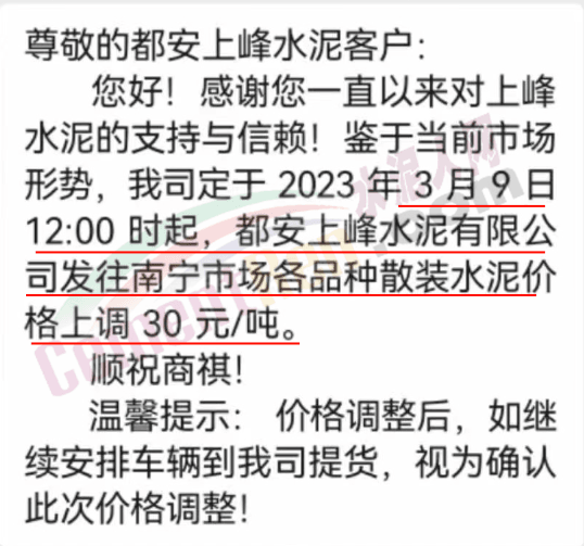 廣西都安上峰通知,鑒于當(dāng)前市場(chǎng)形勢(shì),公司定于2023年3月9日12時(shí)起,發(fā)往南寧市場(chǎng)各品種散裝水泥價(jià)格上調(diào)30元/噸。