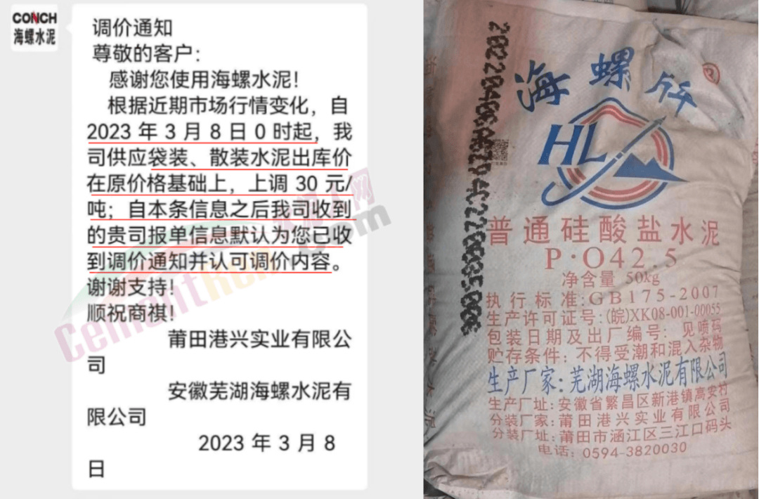 日前,莆田港興實(shí)業(yè)有限公司和安徽蕪湖海螺水泥有限公司聯(lián)合發(fā)消息稱,根據(jù)近期市場(chǎng)行情變化,自2023年3月8日0時(shí)起,公司供應(yīng)袋裝、散裝水泥出庫價(jià)在原價(jià)格基礎(chǔ)上上調(diào)30元/噸。