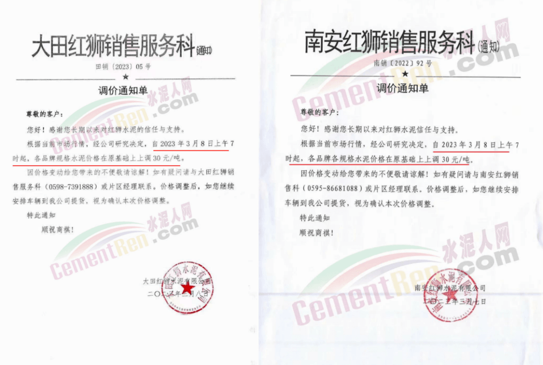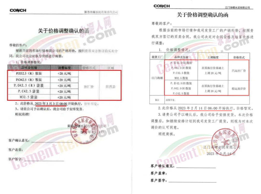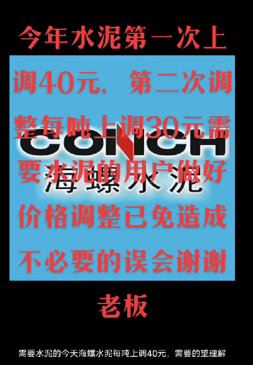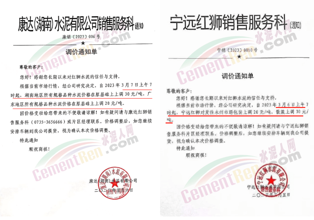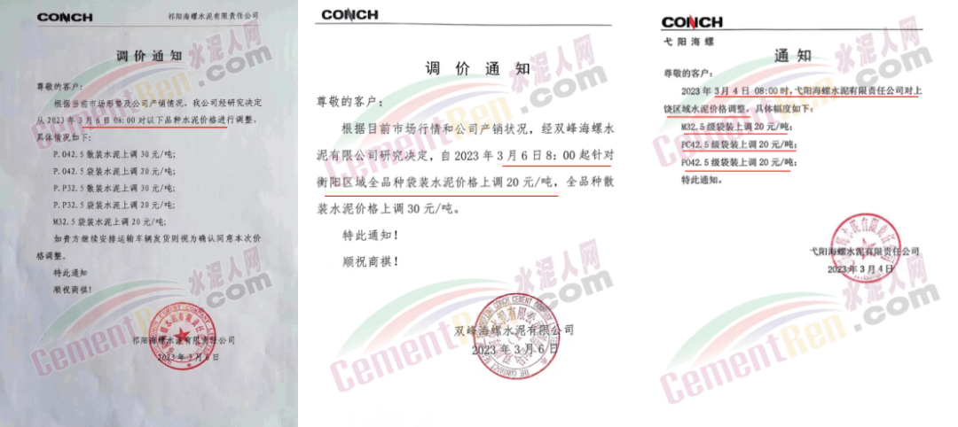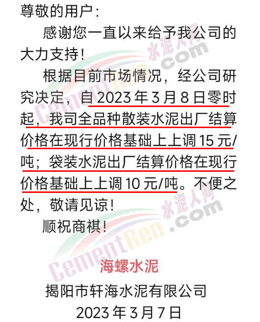 經(jīng)銷海螺水泥的揭陽市軒海水泥有限公司通知,根據(jù)目前市場(chǎng)情況,經(jīng)公司研究決定,自2023年3月8日零時(shí)起,公司全品種散裝水泥出廠結(jié)算價(jià)格在現(xiàn)行價(jià)格基礎(chǔ)上上調(diào)15元噸;袋裝水泥出廠結(jié)算價(jià)格在現(xiàn)行價(jià)格基礎(chǔ)上上調(diào)10元/噸。