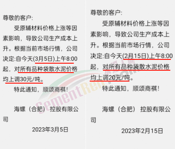 海螺(合肥)控股有限公司分別于2月15日和3月5日通知上調(diào)水泥價(jià)格20元/噸、30元/噸,兩次累計(jì)上調(diào)50元/噸。