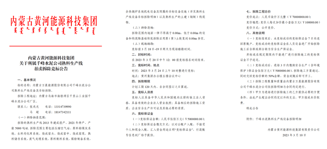 日前,內蒙古黃河能源科技集團發(fā)布《關于所屬千峰水泥公司熟料生產線拍賣拆除競標公告》公開內蒙古萬晨能源股份有限公司千峰水泥分公司熟料生產線設備及非標拆除。