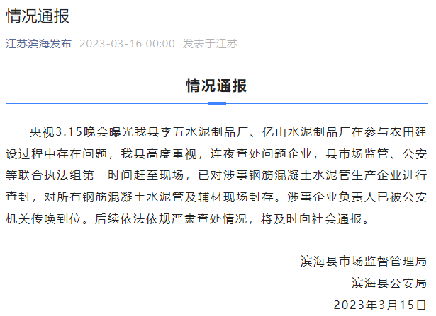 據(jù)“江蘇濱海發(fā)布”微信號(hào)16日0時(shí)消息,濱海縣市場監(jiān)督管理局、濱海縣公安局通報(bào)稱,央視“3.15”晚會(huì)曝光濱海縣李五水泥制品廠、億山水泥制品廠在參與農(nóng)田建設(shè)過程中存在問題,濱海縣高度重視,連夜查處問題企業(yè),縣市場監(jiān)管、公安等聯(lián)合執(zhí)法組第一時(shí)間趕至現(xiàn)場,已對涉事鋼筋混凝土水泥管生產(chǎn)企業(yè)進(jìn)行查封,對所有鋼筋混凝土水泥管及輔材現(xiàn)場封存。涉事企業(yè)負(fù)責(zé)人已被公安機(jī)關(guān)傳喚到位。后續(xù)依法依規(guī)嚴(yán)肅查處情況,將及時(shí)向社會(huì)通報(bào)。