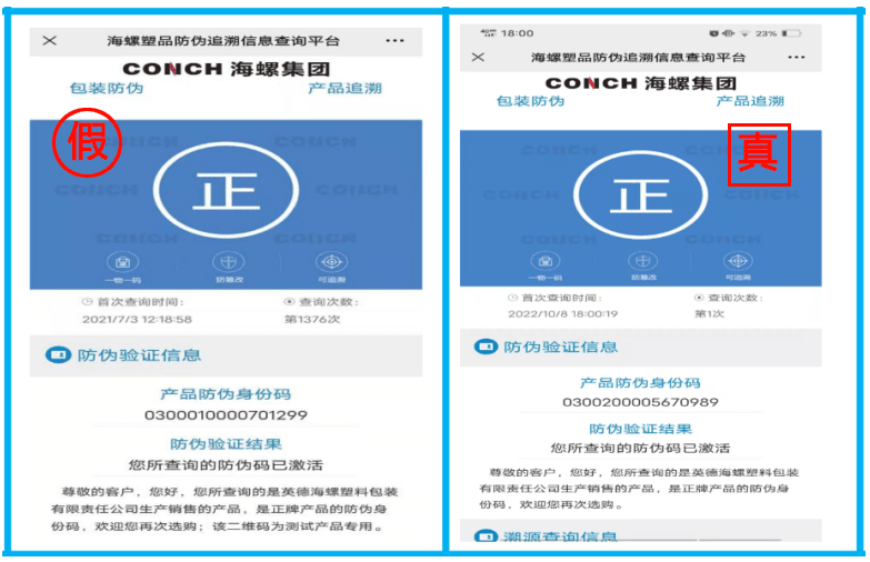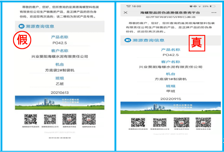 防偽碼查詢:查詢二維碼查看袋子生產(chǎn)日期與外包裝生產(chǎn)日期是否一致。例:假水泥二維碼查詢袋子生產(chǎn)日期為2021年6月13日,包裝袋印刷生產(chǎn)日期為2022年9月5日,兩者不一致;“海螺牌”水泥二維碼袋子生產(chǎn)日期與袋子外印刷生產(chǎn)日期一致。