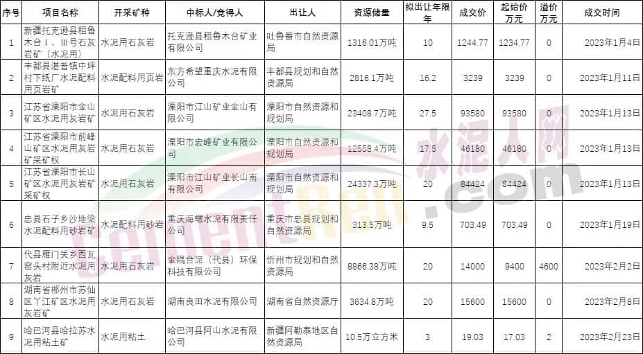 已成交9宗礦山競得企業包含重慶海螺水泥有限責任公司、金隅臺泥(代縣)環保科技有限公司、湖南良田水泥有限公司、東方希望重慶水泥有限公司等水泥行業知名企業。