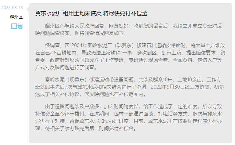 秦嶺水泥(現冀東)修建運輸帶遺留問題,共涉及群眾10戶,土地10余畝。工作專班就此事先后7次與冀東水泥和相關群眾進行了協調,2022年9月30日經三方協商,初步達成了相關補償協議,網友反映問題也在補償范圍內。