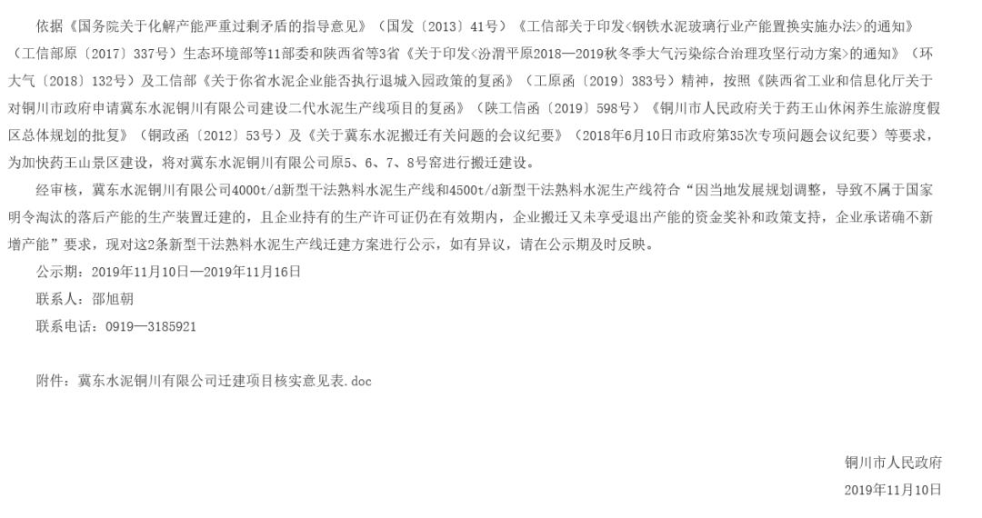 據水泥人網了解,早在2019年陜西銅川市人民政府發布《關于冀東水泥銅川有限公司新型干法熟料水泥生產線項目遷建的公示》稱,為加快藥王山景區建設,將對冀東水泥銅川有限公司原5、6、7、8號窯進行搬遷建設。公示稱,冀東水泥銅川有限公司4000t/d新型干法熟料水泥生產線和4500t/d新型干法熟料水泥生產線符合“因當地發展規劃調整,導致不屬于國家明令淘汰的落后產能的生產裝置遷建的,且企業持有的生產許可證仍在有效期內,企業搬遷又未享受退出產能的資金獎補和政策支持,企業承諾確不新增產能”要求。