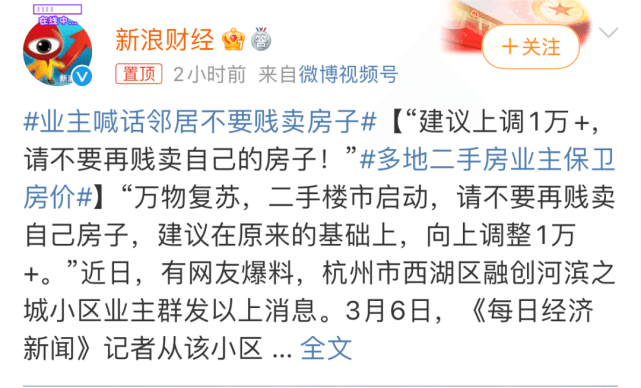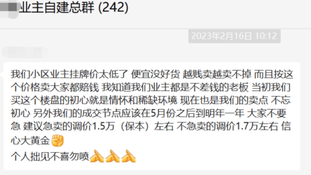浙江杭州某個高端小區(qū)的小區(qū)業(yè)主呼吁:“萬物復(fù)蘇,二手樓市啟動,請不要再賤賣自己房子,建議在原來的基礎(chǔ)上,向上調(diào)整1萬+”。