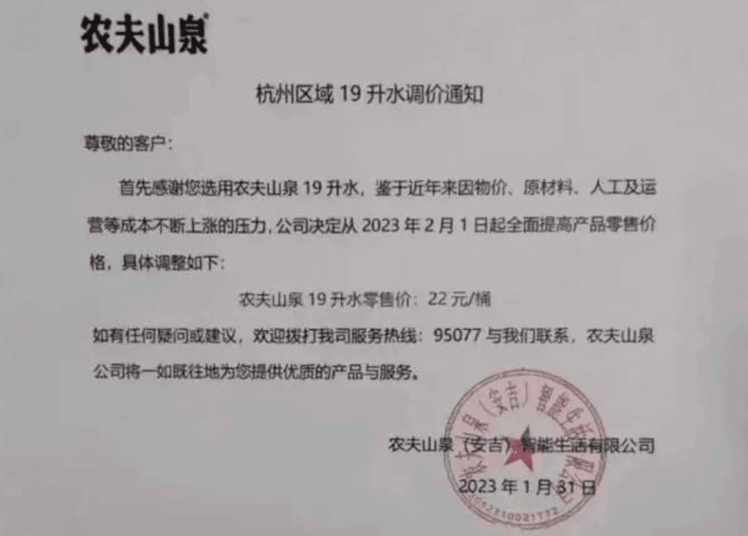 農(nóng)夫山泉自2022年上海將農(nóng)夫山泉19L天然水零售價由26元/桶調(diào)整到28元/桶后,今年1月杭州將每桶增加了2元的價格,漲幅10%。
