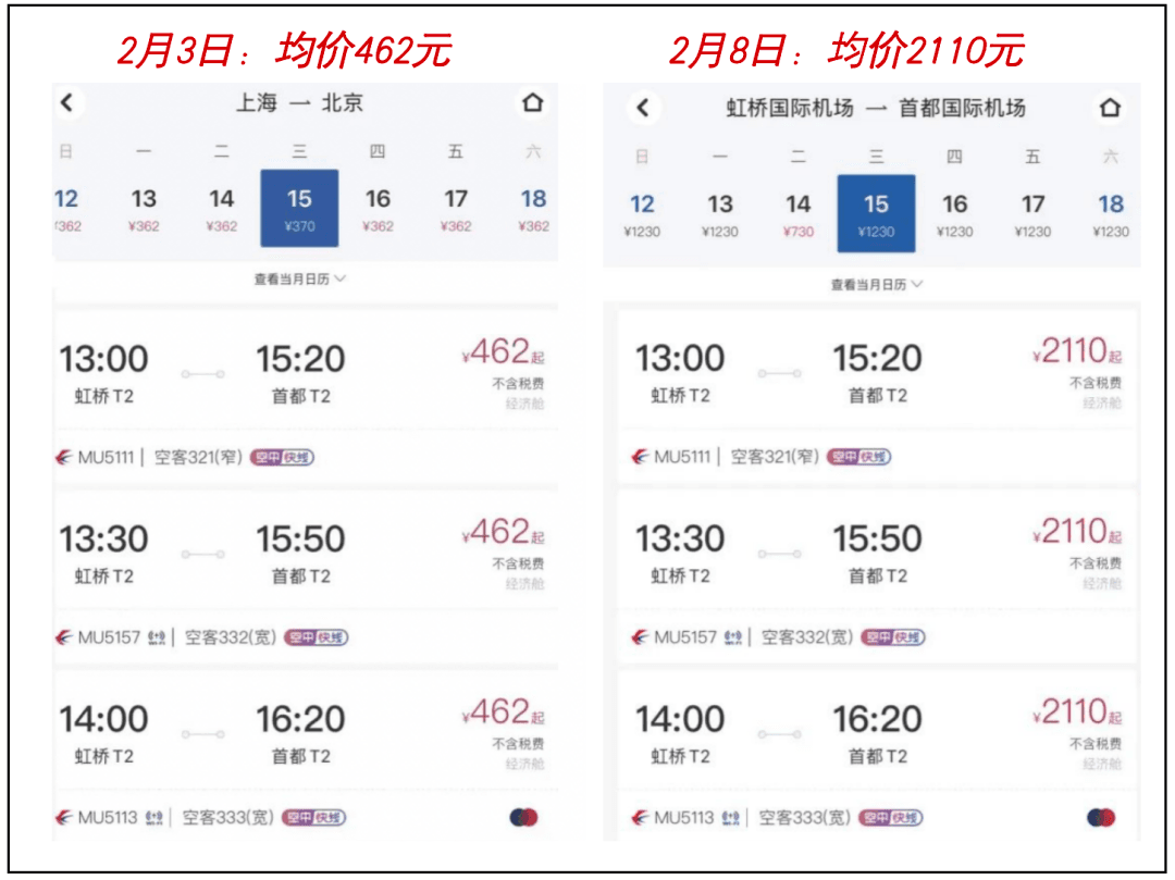 出行的票價也在上漲。同樣的地點、同樣的時間段,2月3日價格還不到500元,短短5天內(nèi),機票價格就普遍超過了2000元。