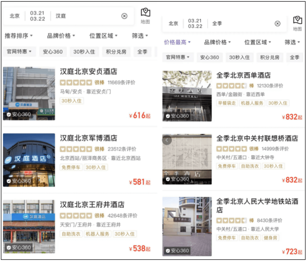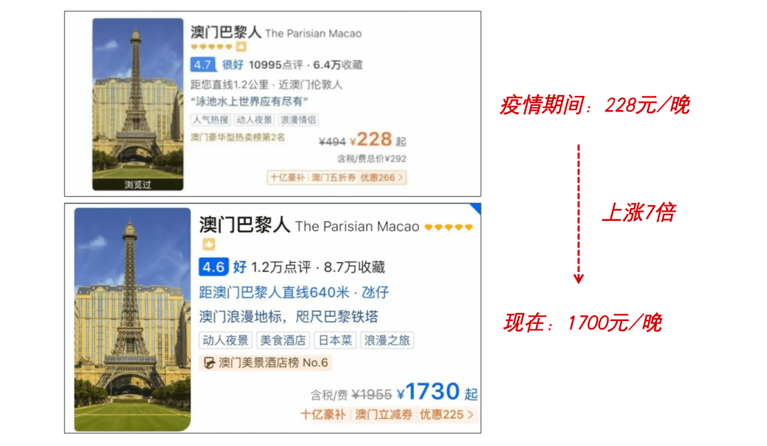 如家、漢庭等酒店突破500元,全季、桔子酒店基本600元以上,亞朵等更是普遍漲到700元以上。港澳地區(qū)部分酒店從疫情期間的200多元直接漲到了1700多元。