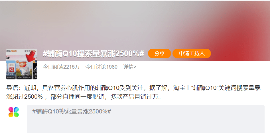 電商平臺上搜索“輔酶Q10”的關(guān)鍵詞量上漲了2500%,有的直播間出現(xiàn)斷貨現(xiàn)象,一些產(chǎn)品的月銷量達到了一萬件以上。許多線上線下渠道都已賣斷貨,有多名網(wǎng)友還爆料個別產(chǎn)品短期內(nèi)價格漲幅明顯,“一天一提價”引發(fā)廣泛熱議。