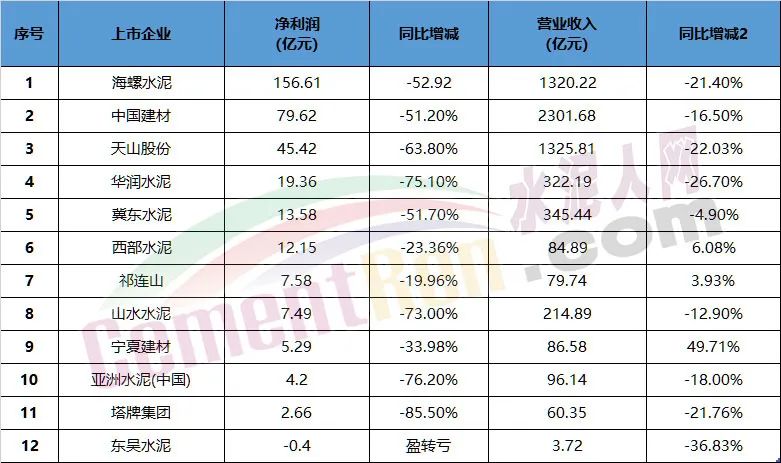 近期12家水泥上市公司先后發布了2022年度業績報告,其中包括海螺水泥、冀東水泥、華潤水泥在內的9家水泥上市公司呈現營收、利潤額雙下滑的情況,西部水泥、祁連山、寧夏建材3家上市公司出現增收不增利的情況。