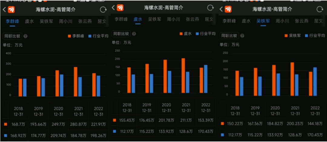 從海螺水泥2022年度報告數據可見,2022年度海螺水泥營業收入和凈利潤雙雙下滑,截至2022年12月31海螺水泥上市公司14位高管中已公布薪酬的9位高管薪酬合計約1068萬元。包括總經理李群峰、副總經理虞水、吳鐵軍等在內的多位高管2022年薪酬較2021年有所減少。其中,李群峰降薪58.97萬元,虞水降薪57.71萬元,吳鐵軍降薪56.05萬元。