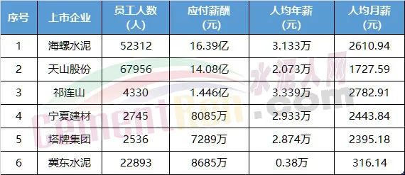 照此核算,A股已公布業績的6家上市企業中,5家企業人均月薪均在2800元以下,平均月薪2392元。冀東水泥員工人數從2021年至今一直保持22893人,人均月薪僅為316.14元。