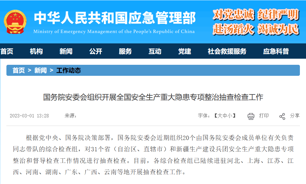 近日,從應急管理部網站獲悉,根據黨中央、國務院決策部署,國務院安委會近期組織20個由國務院安委會成員單位有關負責同志帶隊的綜合檢查組,對31個省(自治區、直轄市)和新疆生產建設兵團安全生產重大隱患專項整治和督導檢查工作情況進行抽查檢查。目前,各綜合檢查組已陸續進駐河北、上海、江蘇、江西、河南、湖南、廣東、廣西、云南等地開展抽查檢查工作。
