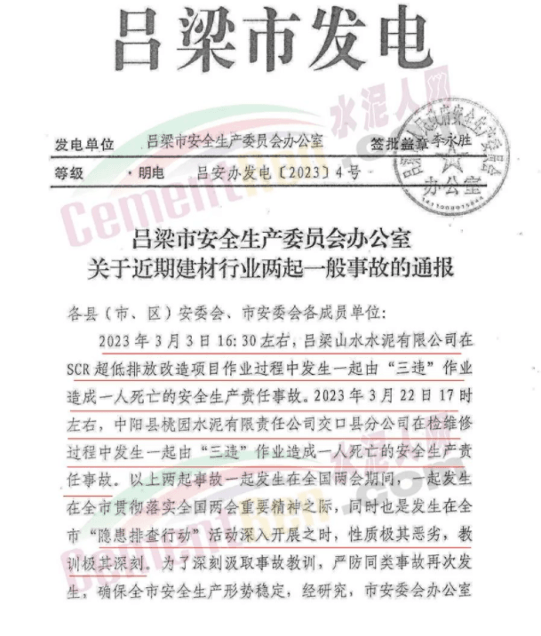 據(jù)呂梁市安全生產(chǎn)委員會辦公室通報:2023年3月3日16:30左右,呂梁山水水泥有限公司在SCR超低排放改造項目作業(yè)過程中發(fā)生一起由“三違”作業(yè)造成一人死亡的安全生產(chǎn)責任事故。
