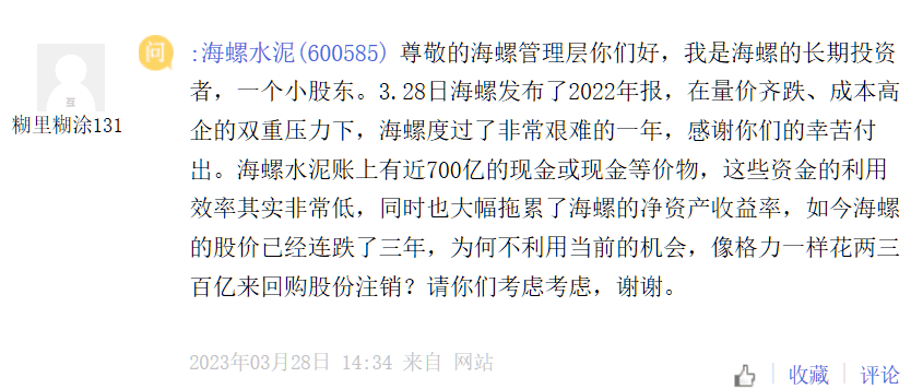 另有一位海螺的長期投資者表示:海螺水泥2022年在量價齊跌、成本高企的雙重壓力下,海螺度過了非常艱難的一年,感謝你們的辛苦付出。海螺水泥賬上有近700億的現金或現金等價物,這些資金的利用效率其實非常低,同時也大幅拖累了海螺的凈資產收益率,如今海螺的股價已經連跌了三年,為何不利用當前的機會,像格力一樣花兩三百億來回購股份注銷?