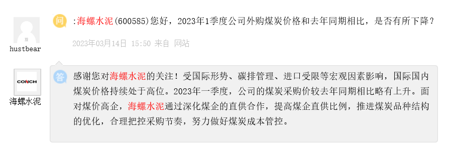 海螺水泥回復稱,2023年,公司將繼續深耕水泥主業,抓實市場建設,因時因勢差異施策,掌握市場競爭主動,穩份額,降成本,增效益。