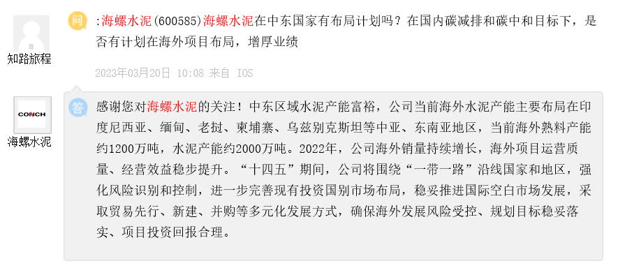 問題七:海螺水泥在中東國家有布局計劃嗎?在國內碳減排和碳中和目標下,是否有計劃在海外項目布局,增厚業績?