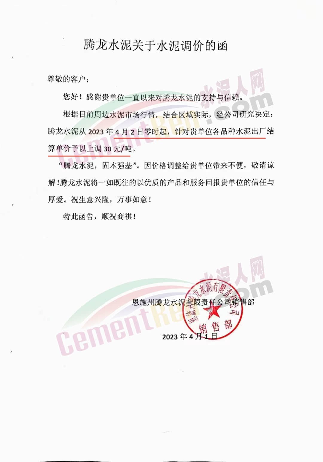恩施州騰龍水泥有限責任公司銷售部通知,根據目前周邊水泥市場行情,結合區域實際,經公司研究決定騰龍水泥從2023年4月2日零時起,各品種水泥出廠結算單價上調30元/噸。