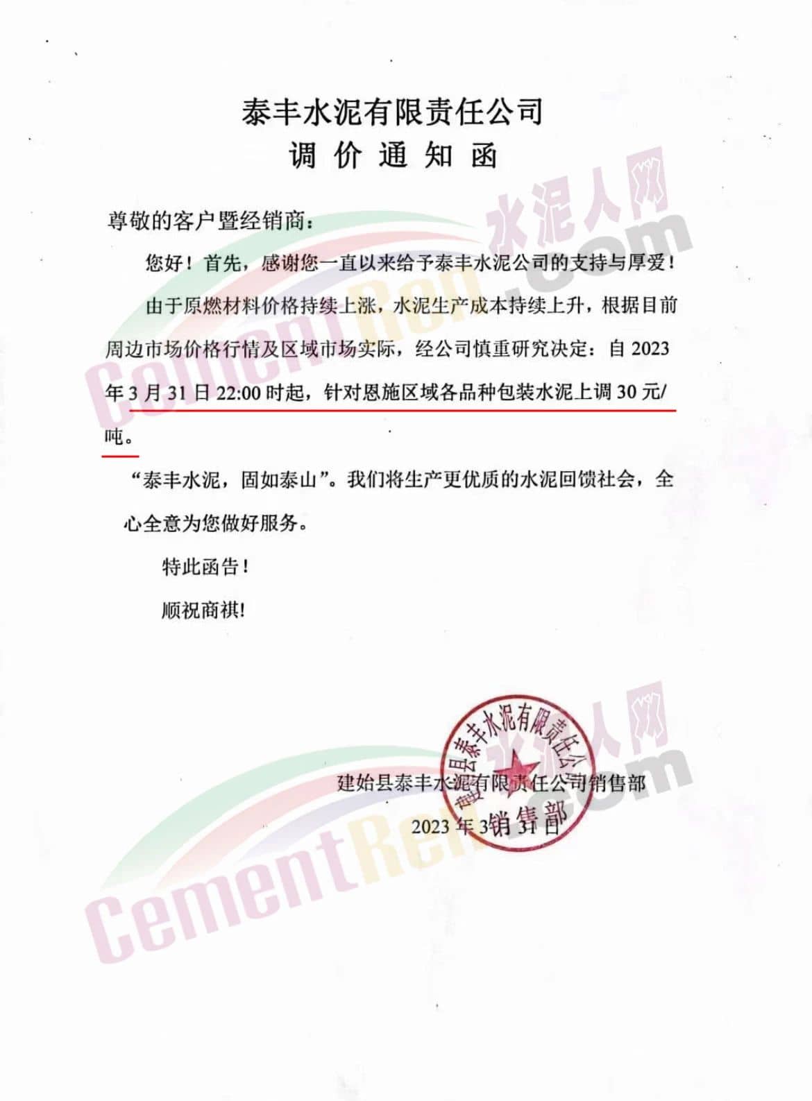 建始縣泰豐水泥有限責任公司銷售部通知,由于原燃材料價格持續上漲,水泥生產成本持續上升,根據目前周邊市場價格行情及區域市場實際,經公司慎重研究決定,自2023年3月31日22:00時起,針對恩施區域各品種包裝水泥上調30元/噸。
