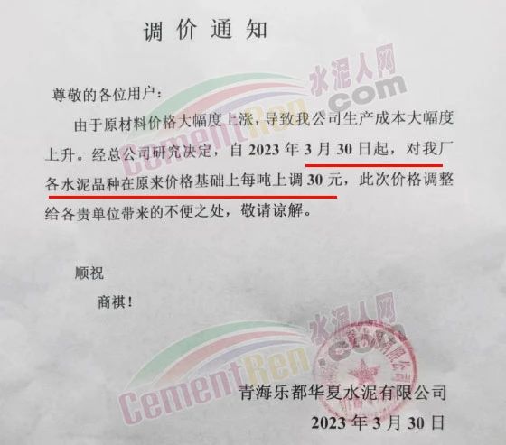 青海樂都華夏水泥有限公司通知,由于原材料價格大幅度上漲,導致我公司生產成本大幅度上升。經總公司研究決定,自2023年3月30日起,對公司各水泥品種在原來價格基礎上每噸上調30元。