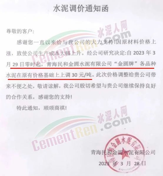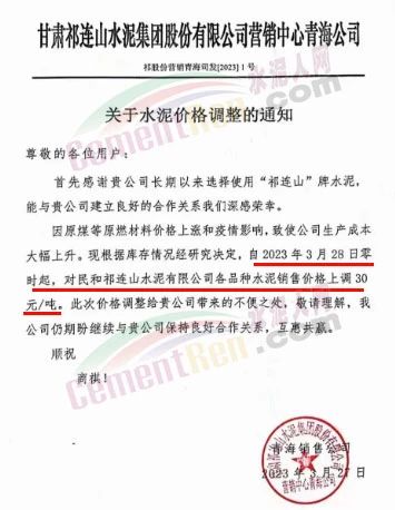 甘肅祁連山水泥集團股份有限公司營中心青海公司通知,因原煤等原燃材料價格上漲和疫情影響,致使公司生產成本大幅上升。現根據庫存情況經研究決定,自2023年3月28日零時起,對民和祁連山水泥有限公司各品種水泥銷售價格上調30元/噸。