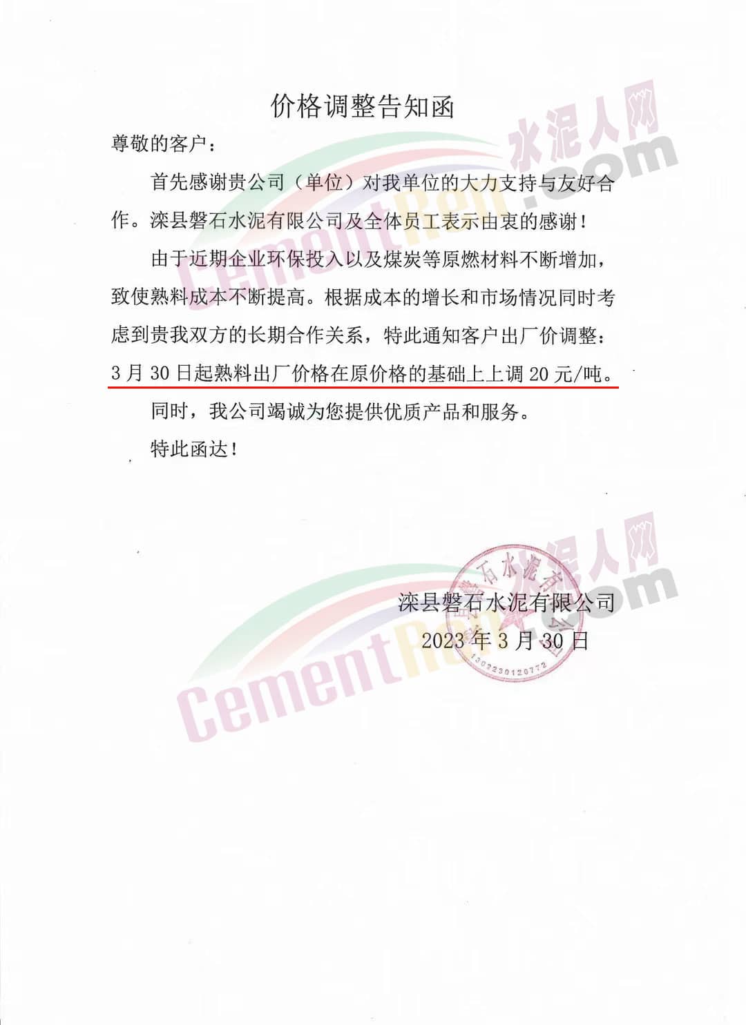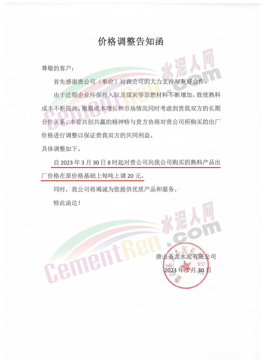 唐山圣龍水泥有限公司通知,由于近期企業環保投入以及煤炭等原燃材料不斷增加,致使熟料成本不斷提高。自2023年3月30日8時起熟料產品出廠價格在原價格基礎上每噸上調20 元。