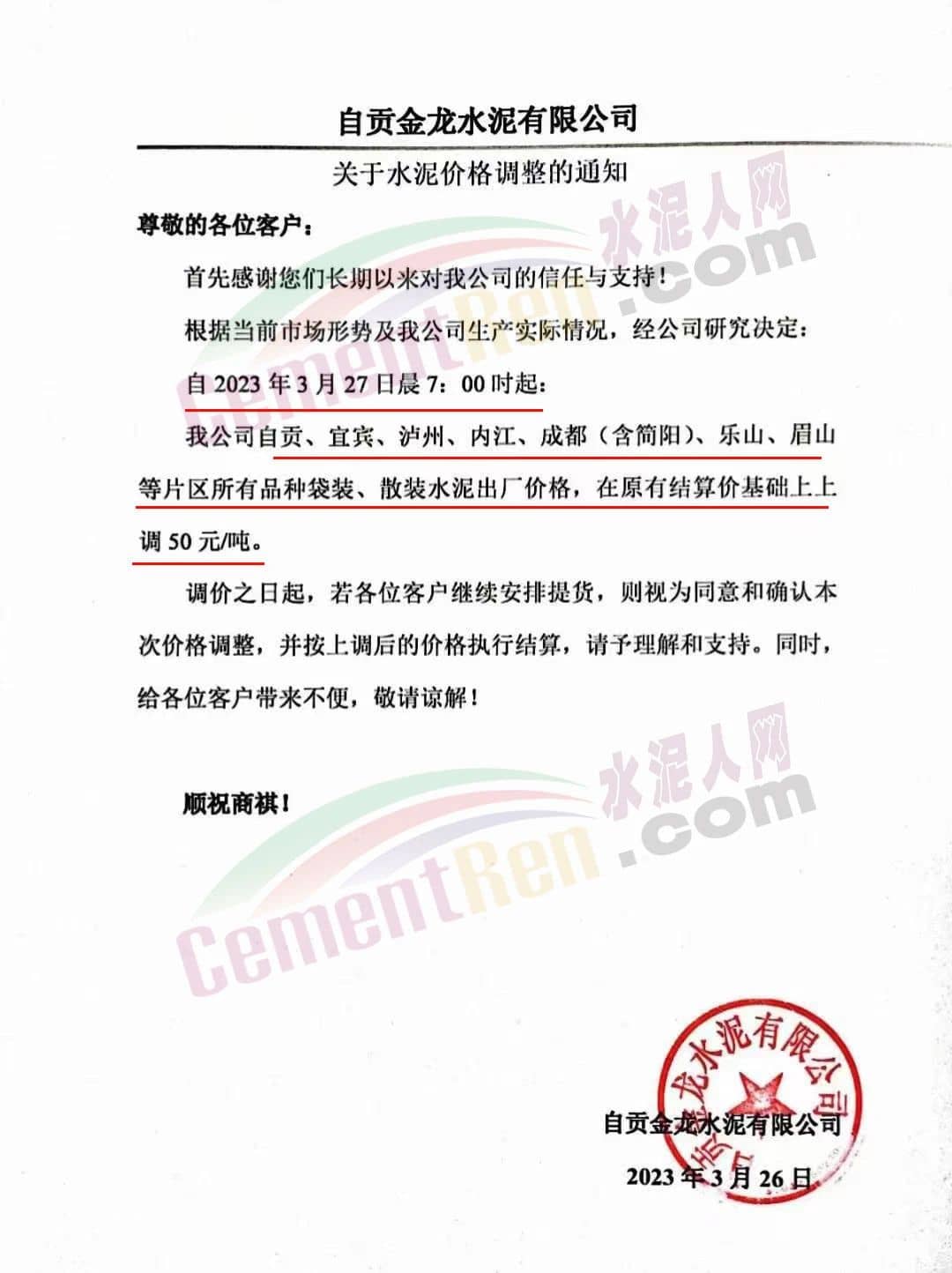 自貢金龍水泥有限公司通知,根據當前市場形勢及我公司生產實際情況,經公司研究決定自2023年3月27日晨7時起,自貢、宜賓、瀘州、內江、成都(含簡陽)、樂山、眉山等片區所有品種袋裝、散裝水泥出廠價格,在原有結算價基礎上上調50元/噸。