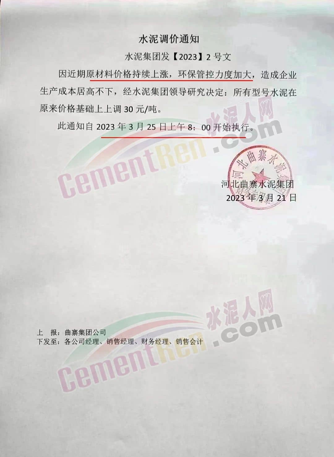 河北曲寨水泥集團通知,因近期原材料價格持續上漲,環保管控力度加大,造成企業生產成本居高不下,經水泥集團領導研究決定自2023年3月25日上午8時開始所有型號水泥在原來價格基礎上上調30元/噸。