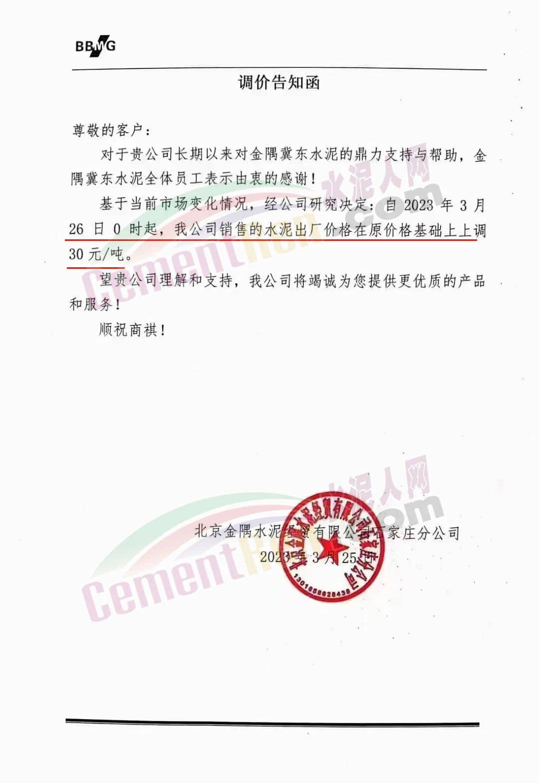 北京金隅水泥有限公司石家莊分公司通知基于當前市場變化情況,經公司研究決定自2023年3月26日0時起,公司銷售的水泥出廠價格在原價格基礎上上調30元/噸。
