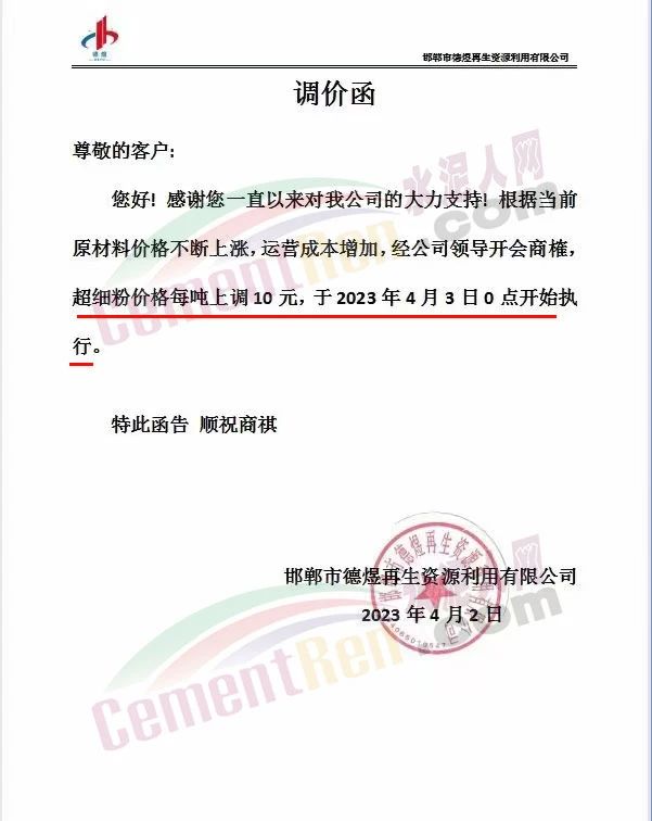 邯鄲市德煜再生資源利用有限公司通知,根據當前原材料價格不斷上漲,運營成本增加,經公司領導開會商榷,從2023年4月3日0點開始超細粉價格每噸上調10元。