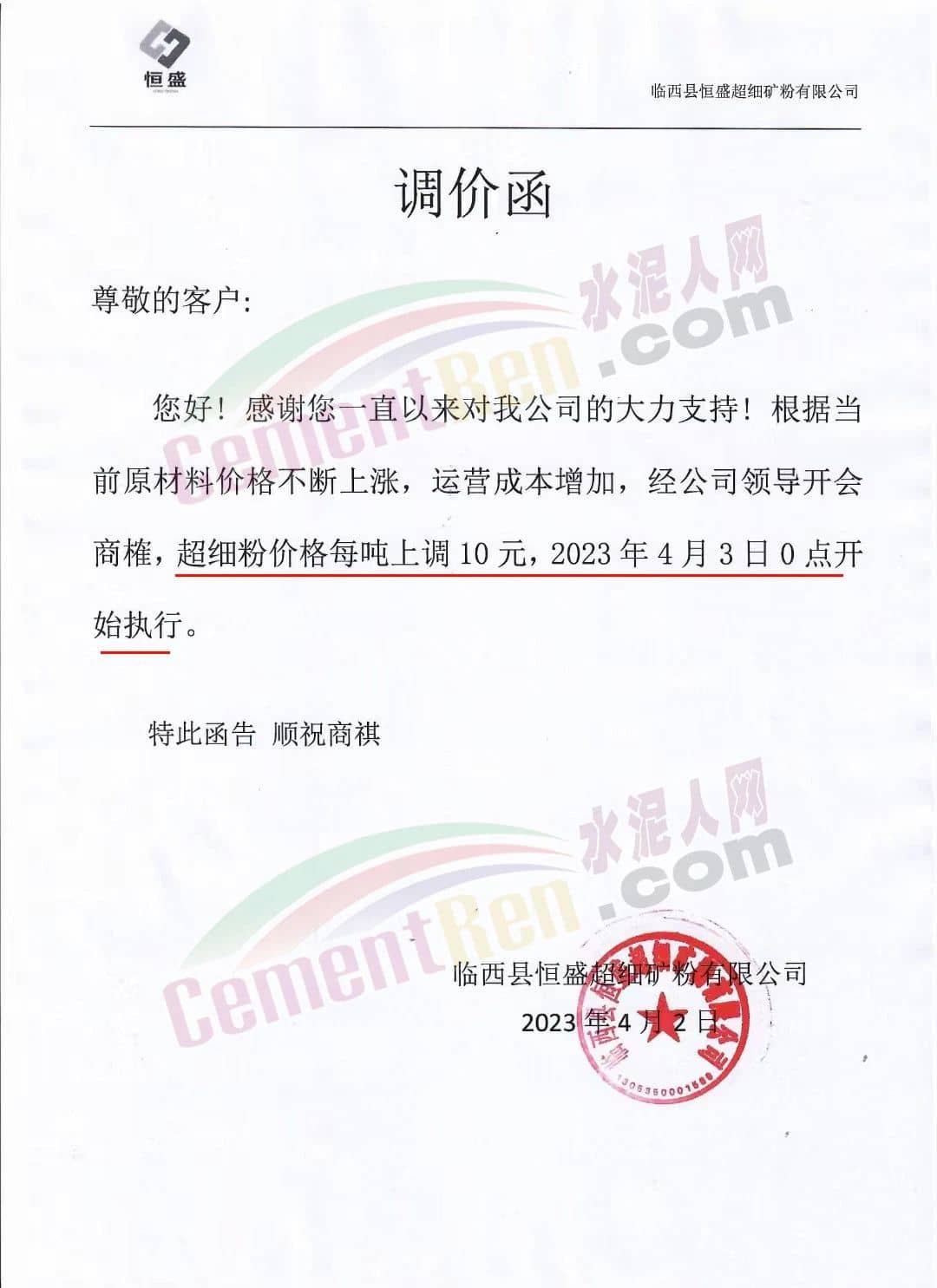 臨西縣恒盛有限公司通知,根據當前原材料價格不斷上漲,運營成本增加,經公司領導開會商榷,超細粉價格每噸上調10元,2023年4月3日0點開始執行。