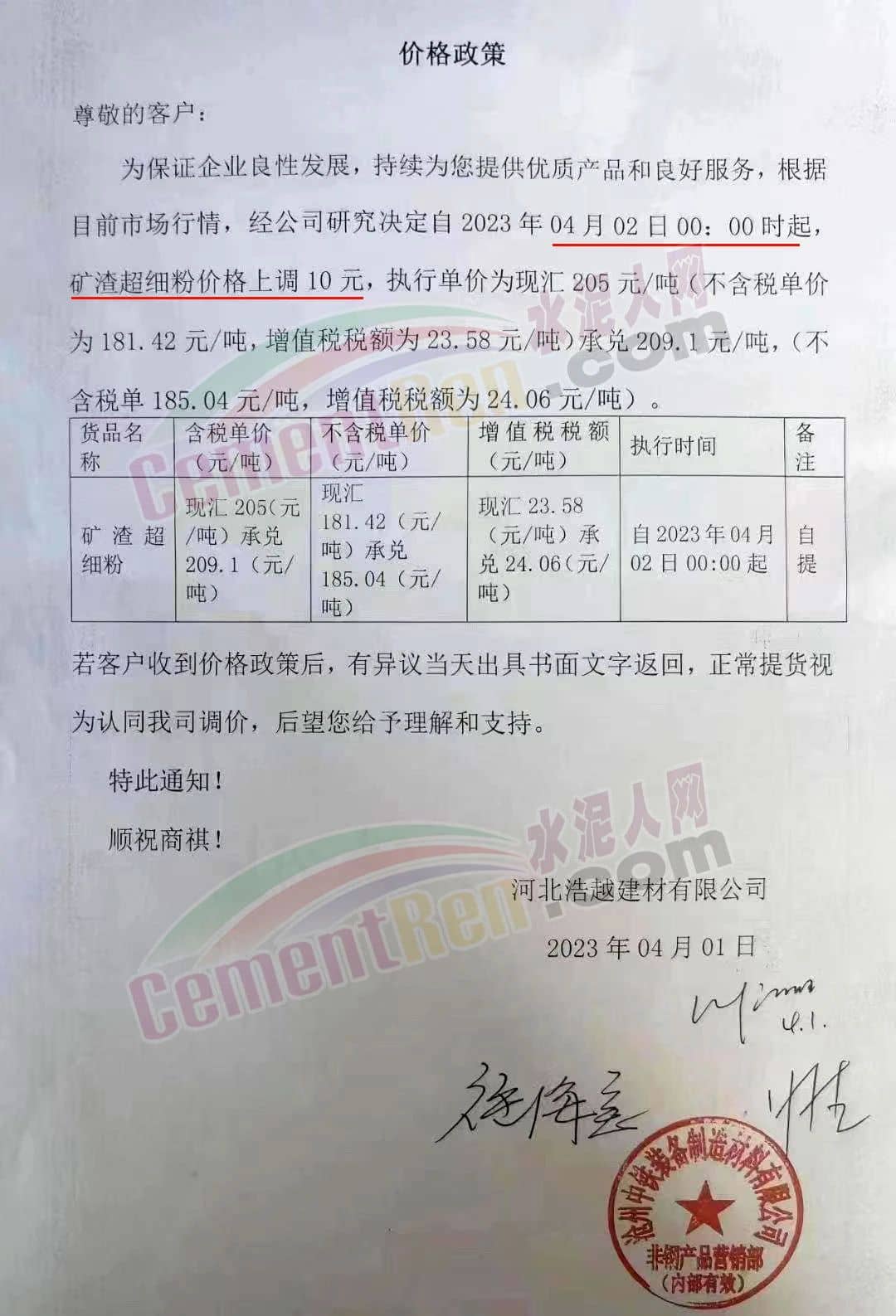 河北浩越建材有限公司通知,根據目前市場行情,經公司研究決定自2023年4月2日0時起礦渣超細粉價格上調10元/噸。