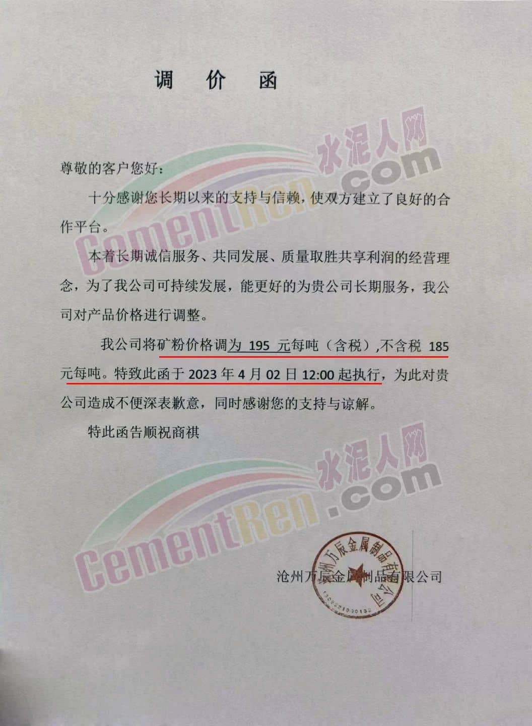 滄州萬辰金屬制品著有限公司通知于2023年4月2日12時起執行礦粉價格調整為195元每噸(含稅),不含稅185元每噸。