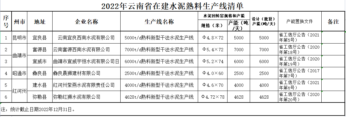 其中包括2022年10月投產的安徽池州海螺水泥股份有限公司10000t/d熟料生產線、2022年8月投產的合肥南方水泥有限公司6000t/d熟料生產線以及2021年12月投產的馬鞍山鐵鵬水泥有限公司4000t/d。