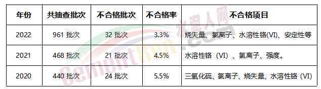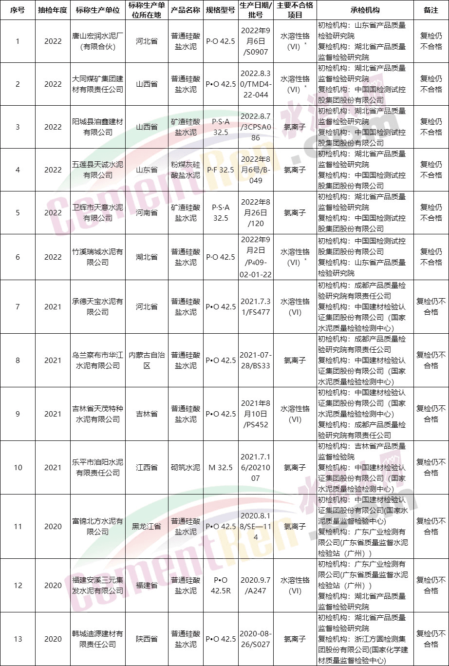 水泥人網(wǎng)注意到,2022年不合格產(chǎn)品較上年增加了11個批次,而且近三年國抽不合格項目中均包含氯離子、水溶性鉻(Ⅵ)。2020年~2022年國抽不合格名單中有13家企業(yè)復(fù)檢仍不合格。其中2022年國抽復(fù)檢仍不合格的企業(yè)共6個批次,2021年4個批次,2020年3個批次。