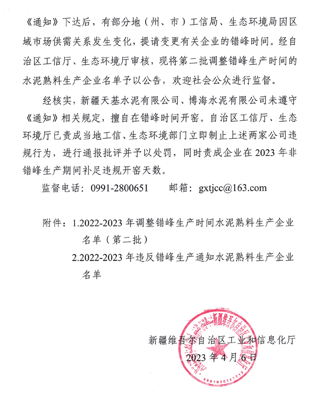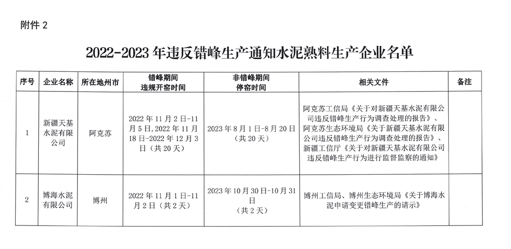 日前,新疆維吾爾自治區(qū)工信廳發(fā)布公告文件公開通報(bào)新疆天基水泥有限公司、博海水泥有限公司未遵守《通知》相關(guān)規(guī)定,擅自在錯峰時(shí)間開窯。自治區(qū)工信廳、生態(tài)環(huán)境廳已責(zé)成當(dāng)?shù)毓ば拧⑸鷳B(tài)環(huán)境部門立即制止上述兩家公司違規(guī)行為,進(jìn)行通報(bào)批評并予以處罰,同時(shí)責(zé)成企業(yè)在 2023 年非錯峰生產(chǎn)期間補(bǔ)足違規(guī)開窯天數(shù)。