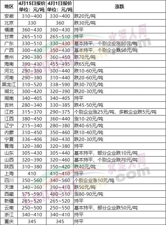漲價發通知,跌價不通知。一片跌跌不休中,水泥價格越來越不透明,各企業對外報價核心市場、外埠市場、新開發市場各有不同。針對商砼客戶、經銷商、建材店又有不同優惠促銷政策,南方雨季到來,4月中下旬水泥價格大概率仍維持目前下行趨勢。