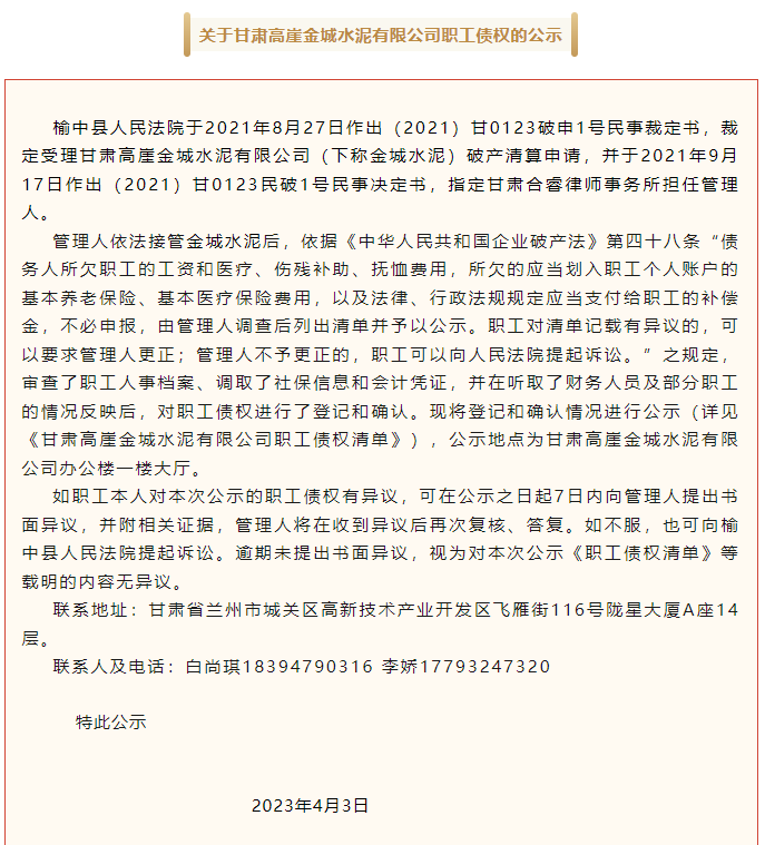 據(jù)水泥人網(wǎng)了解,4月3日,甘肅省蘭州市榆中縣人民法院發(fā)布關(guān)于甘肅高崖金城水泥有限公司職工債權(quán)的公示稱,已于2021年8月27日作出民事裁定書,裁定受理甘肅高崖金城水泥有限公司破產(chǎn)清算申請,并于2021年9月17日指定甘肅合睿律師事務(wù)所擔(dān)任管理人。