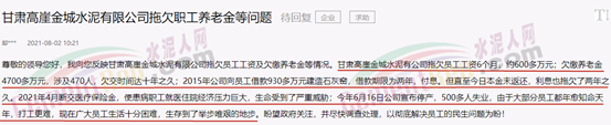 據(jù)水泥人網(wǎng)此前消息,早在2021年就有員工在“領(lǐng)導(dǎo)留言板”留言反映,甘肅高崖金城水泥有限公司拖欠員工工資6個月,約600多萬元,欠繳養(yǎng)老金4700多萬元,涉及470人,欠繳時間達(dá)十年之久。(相關(guān)鏈接:憤怒!涉及470人!又一水泥廠欠薪!)