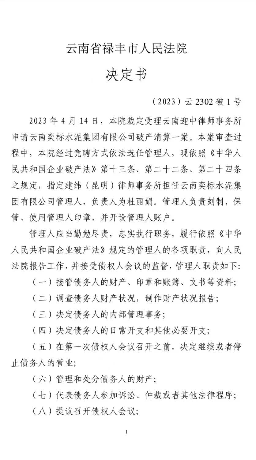 2023年4月14日,云南省祿豐市人民法院裁定受理云南迎中律師事務(wù)所申請?jiān)颇限葮?biāo)水泥集團(tuán)有限公司破產(chǎn)清算一案。本案審查過程中,法院經(jīng)過競聘方式依法選任管理人,并依照《中華人民共和國企業(yè)破產(chǎn)法》第十三條、第二十二條、第二十四條之規(guī)定,指定建緯(昆明)律師事務(wù)所擔(dān)任云南奕標(biāo)水泥集團(tuán)有限公司管理人。