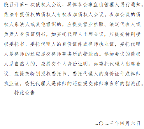 2023年4月6日,河北省臨城縣人民法院公告稱,河北省邢臺市中級人民法院于2023年3月13日作出(2023)冀05破申1號民事裁定書,裁定受理衡水市桃城區(qū)華順石料建材經(jīng)營部對臨城固實(shí)水泥有限公司提出的破產(chǎn)清算申請,并于2023年4月6日指定河北博海清算事務(wù)有限公司為管理人。定于2023年6月16日上午9:00在臨城縣人民法院召開第一次債權(quán)人會議。