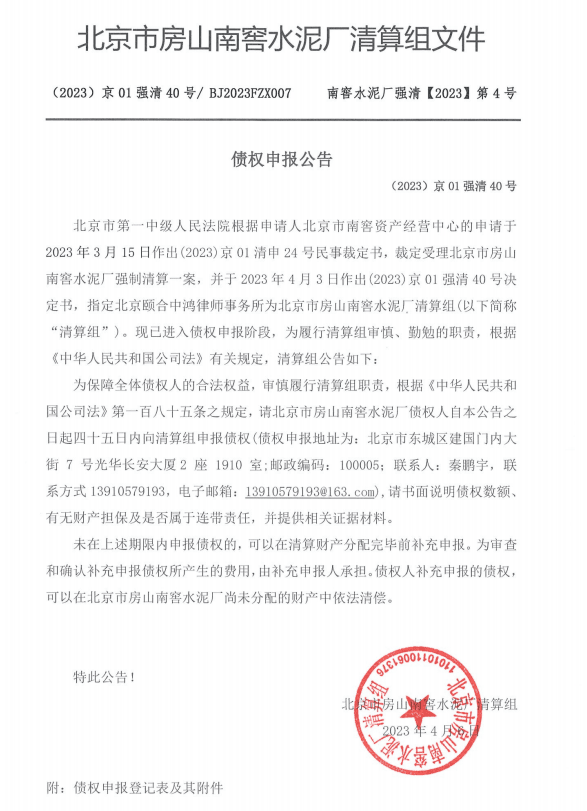 4月6日北京市房山南窖水泥廠清算組發(fā)布債權(quán)申報公告稱,北京市第一中級人民法院于2023年3月15日裁定受理北京市房山南窖水泥廠強(qiáng)制清算一案,并于 2023 年4月3日作出強(qiáng)清40 號決定書,指定北京頤合中鴻律師事務(wù)所為北京市房山南窖水泥廠清算組,現(xiàn)已進(jìn)入債權(quán)申報階段。