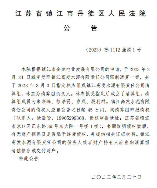 3月30日,江 蘇 省 鎮(zhèn) 江 市 丹 徒 區(qū) 人 民 法 院發(fā)布公告稱,根據(jù)鎮(zhèn)江市金龍電業(yè)發(fā)展有限公司的申請,于 2023 年 2月 24 日裁定受理鎮(zhèn)江高發(fā)水泥有限責(zé)任公司強(qiáng)制清算一案,并于 2023 年 3 月 3 日指定林杰組成鎮(zhèn)江高發(fā)水泥有限責(zé)任公司清算組。